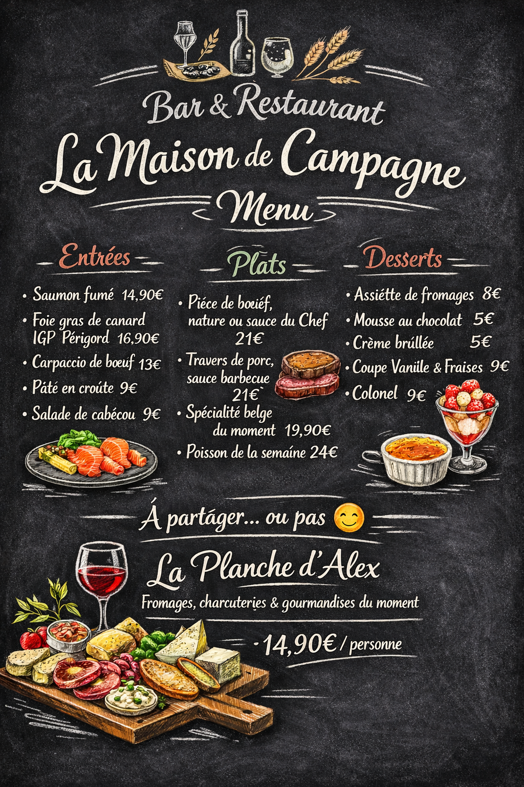 Bienvenue à La Maison de Campagne ! Alex, Tom et Titou vous servent le meilleur du terroir belge et périgourdin, avec humour, fraîcheur et générosité. Ici, on rit, on savoure, on partage.